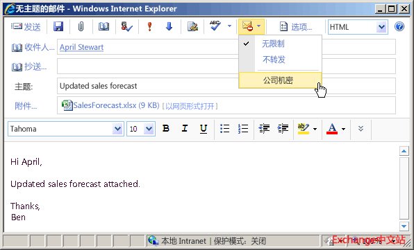 信息工作者越来越多地使用电子邮件交换敏感信息。为帮助保护此类信息的安全,组织可以使用信息权限管理 (IRM) 对邮件内容应用持久保护。在 Microsoft Exchange Server 2010 之前,对 IRM 保护的有效使用仅限于 Outlook 客户端。