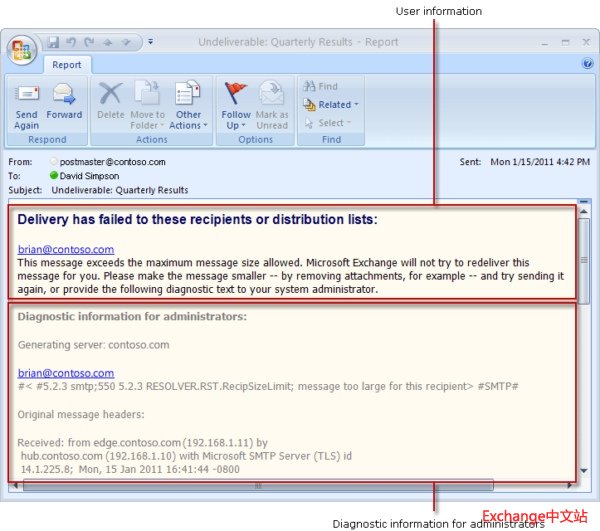 本主题介绍如何在 Microsoft Exchange Server 2013 中阅读和解释未送达报告 (NDR) 的传递状态通知 (DSN) 邮件。在 Exchange 2013 中,经过设计的 NDR 非常易于最终用户和管理员阅读和理解。NDR 中显示的信息分为下列两部分。