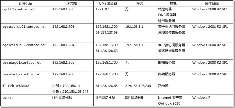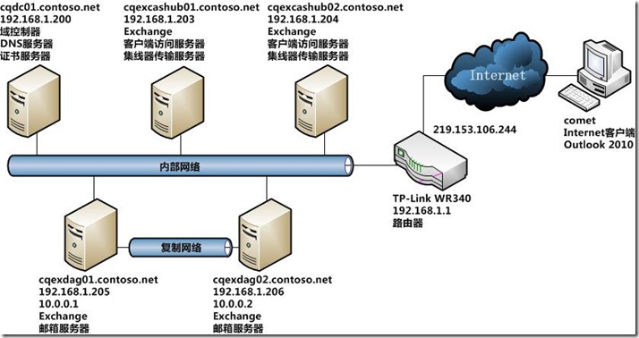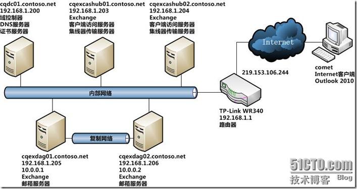 首先来说一下我的环境,我的实验环境为单域环境,域名为非常经典的contoso.net。环境中会用到4台Exchange Server 2010 SP2服务器,我们用其中的2台来部署Exchange的CAS/HUB角色,通过Windows的负载均衡技术。...
