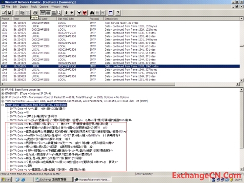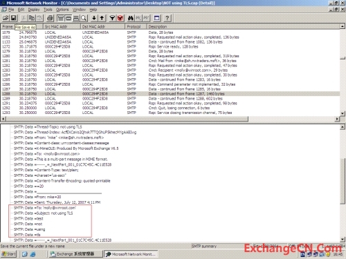 另外,通过在服务器段抓包可以发现,通过TLS连接所传输的邮件内容是无法读取的乱码
