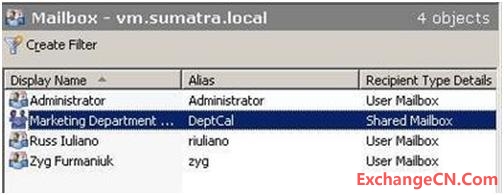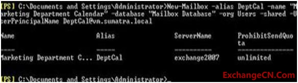 首先通过Exchange Management Shell创建一个SharedMailbox.例如我们创建一个Market Department Group 日历的SharedMailbox.注意不能从通过ExchangeManagementConsole创建。