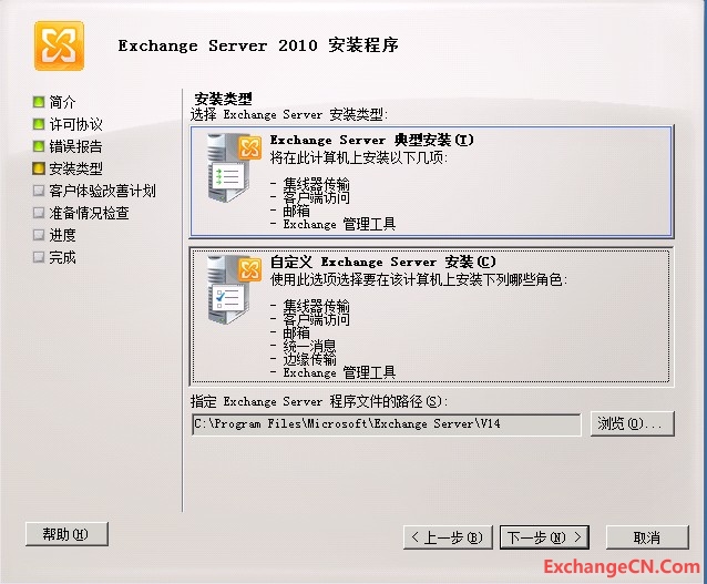 运行Exchange安装程序,在“安装类型”界面选择“自定义Exchange Server安装”: