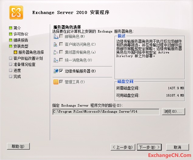 Exchange的边缘服务器安装比较简单,而已整个过程也不需要像安装Exchange的其它服务器那样,需要做许多的准备工作。