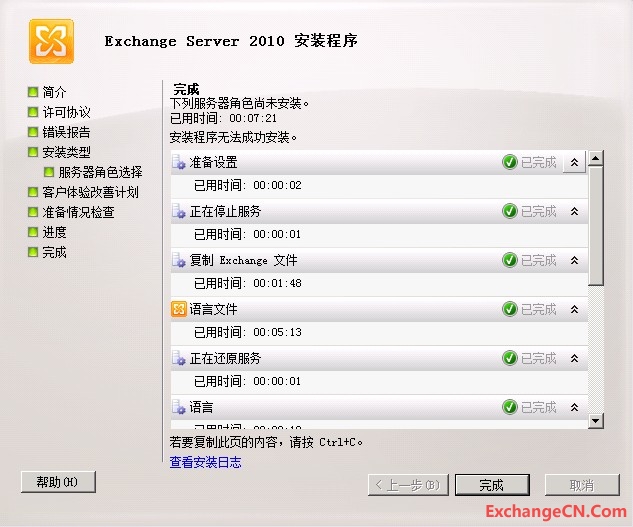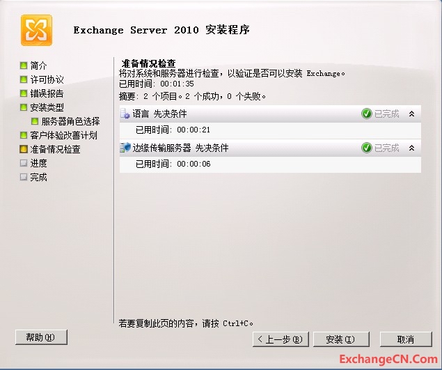 经过“检查安装”的程序后,最后傻瓜式的下一步即可完成Exchange 2010边缘传输服务器的安装。