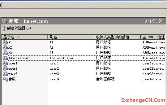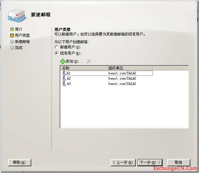 首先我们创建了三个用户作为测试。然后进入控制台,选择新建邮箱,仍然选择用户邮箱。