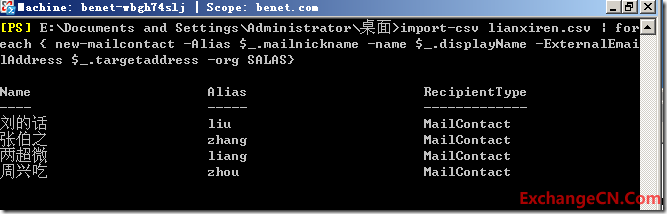 命令如上图,需要注意的是,文档里的标点符号需要是美式键盘的标点符号,如果是其他输入的标点符号,在键入的时候会报错。这样就完成了批量创建联系人了,我们去看一下效果。