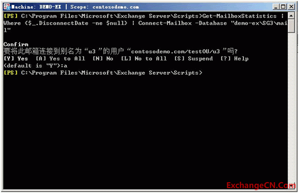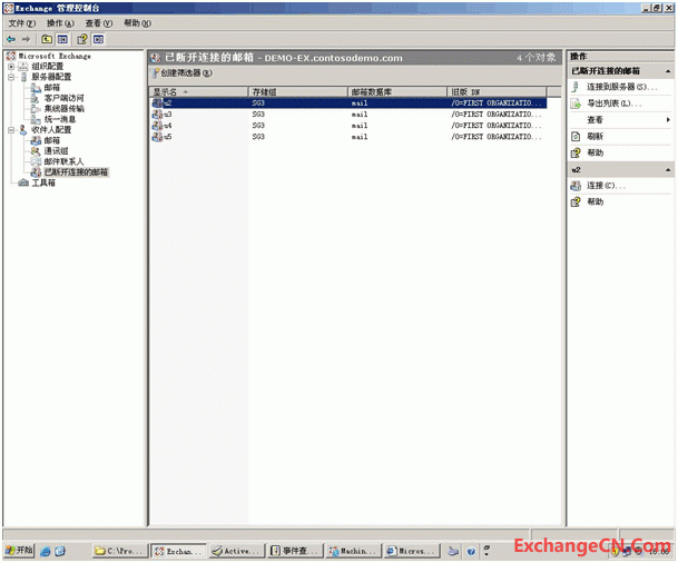 此时我们已经将原来的数据库文件装入到新的AD组织当中了,并且这些邮箱是处于已断开连接的邮箱,但是当前情况下我 们在Exchange管理控制台中无法浏览到这些信息,我们需要在Exchange PowerShell中运行下面的命令才可以浏览到这些用户信息