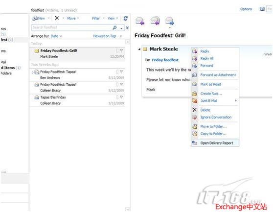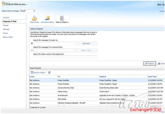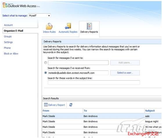 如果你想找某封邮件的Delivery Reports或者你没有找到某封邮件,你可以查询Delivery Reports。登陆owa,点击option,”Organize E-mail”,你可以看到Delivery Reports标签。