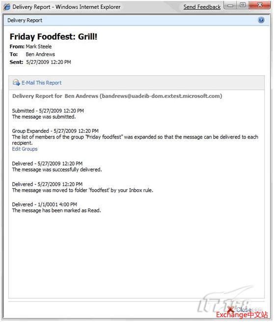 Delivery Reports中对收到的邮件将包含如下信息:你是该邮件被发送的哪组成员?邮件为何在某文件夹下,而不是收件箱中?