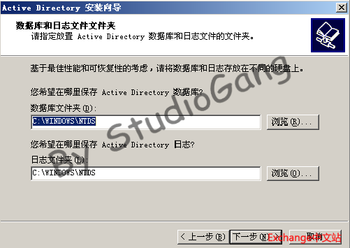 8.指定AD的数据库和日志存放位置,根据自己来定,我这里默认的,下一步<通常情况下不建议更改此处的设置因为大多数的数据库文件和日志文件都存储在C盘的数据库文件夹和日志文件夹下。