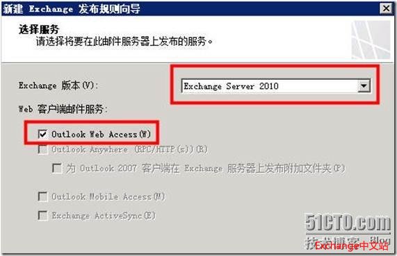 (3)在“选择服务”中,选择“Exchange Server 2010”,并选中“Outlook Web Access”,如图4所示。