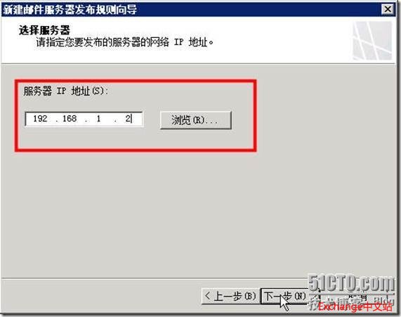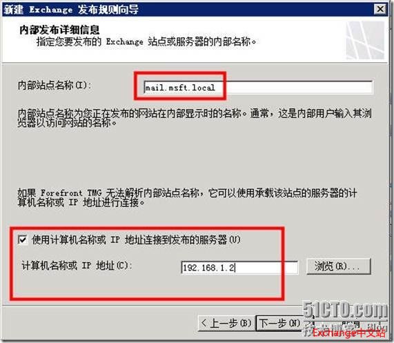 (6)在“内部发布详细信息”页,在“内部站点名称”处键入Exchange OWA内部访问域名mail.msft.local,并选中“使用计算机名称或IP地址连接到发布的服务器”,并设置Exchange 2010服务器的地址192.168.1.2,如图7所示。