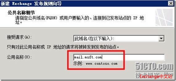 (7)在“公共名称细节”页,设置侦听的域名该域名即是发布到Internet并对外公布的域名(供用户访问)在此为mail.msft.com,如图8所示。