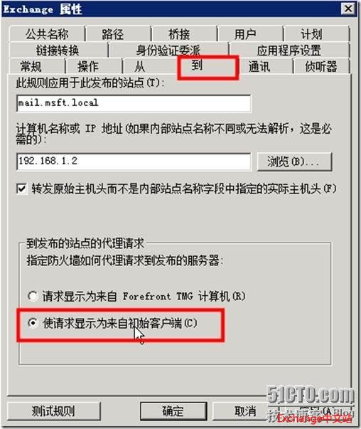 (11)创建完发布规则后,用鼠标双击进入规则,在“到”选项卡中,选中“使请求显示为来自初始客户端“,如图12所示。