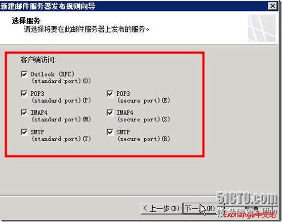 (4)在“选择服务”中,选中所有的服务(实际上POP3不用选择,因为Exchange 2010采用POP3的安全端口发布),如图17所示。