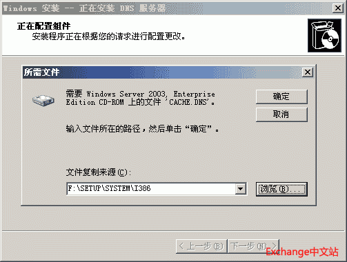 第3步,向导开始安装DNS服务器,并且可能会提示插入Windows Server 2003的安装光盘或指定安装源文件(如图2)。