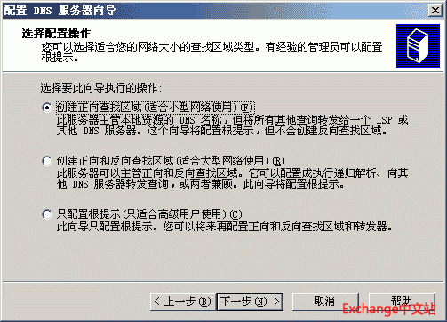 第1步,在“配置DNS服务器向导”的欢迎页面中单击“下一步”按钮,打开“选择配置操作”向导页。在默认情况下适合小型网络使用的“创建正向查找区域”单选框处于选中状态。而巴哥所管理的网络就不太大,因此保持默认选项并单击“下一步”按钮(如图3)。