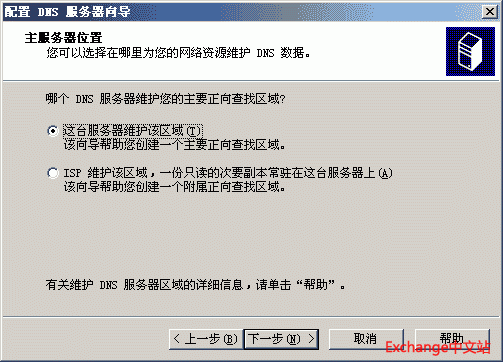 第2步,打开“主服务器位置”向导页,如果所部署的DNS服务器是网络中的第一台DNS服务器则应该保持“这台服务器维护该区域”单选框的选中状态,将该DNS服务器作为主DNS服务器使用,并单击“下一步”按钮(如图4)。