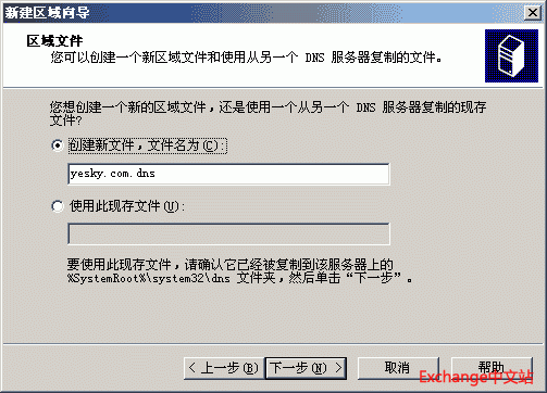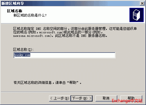 第3步,打开“区域名称”向导页,在“区域名称”编辑框中键入一个能反映公司信息的区域名称(如“yesky.com”),单击“下一步”按钮(如图5)。