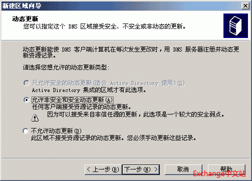 第5步,在打开的“动态更新”向导页中指定该DNS区域能够接受的注册信息更新类型。允许动态更新可以让系统自动地在DNS中注册有关信息,在实际应用中比较有用,因此点选“允许非安全和安全动态更新”单选框,单击“下一步”按钮(如图7)。