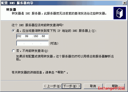 第6步,打开“转发器”向导页,保持“是,应当将查询转送到有下列IP地址的DNS服务器上”单选框的选中状态。在IP地址编辑框中键入ISP(或上级DNS服务器)提供的DNS服务器IP地址,单击“下一步”按钮(如图8)。