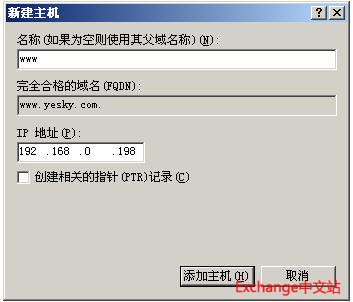 老伟利用向导成功创建了“yesky.com”区域,可是内部用户还不能使用这个名称来访问内部站点,因为它还不是一个合格的域名。接着还需要在其基础上创建指向不同主机的域名才能提供域名解析服务。老伟准备创建一个用以访问Web站点的域名“www.yesky.com”,具体操作步骤如下: