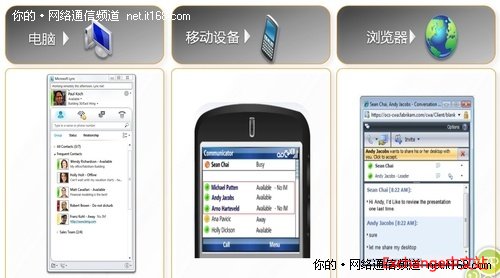 Lync提供了多种多样的访问方式,真正的使用户可以随时随地的进行沟通,Lync支持用户使用PC客户端、Web以及手机等方式的访问,可以换个角度讲,有互联网的地方就可以实现你沟通的愿望。目前,Lync支持许多主流的手机操作系统,如Windows Mobile Phone、苹果以及黑莓等手机操作系统。