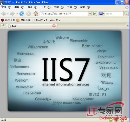 在默认配置下已经有一个测试网站在运行,在浏览器中输入本地的IP地址或http://localhost打开IIS7默认页面。