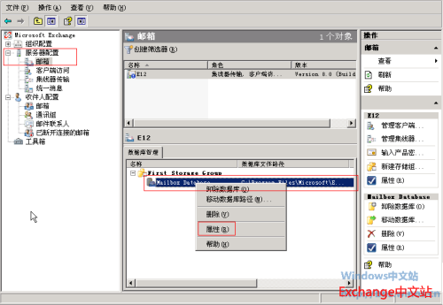 6、打开Exchange管理控制台,展开服务器配置 – 邮箱,找到相应的数据右键点击相应的数据据,然后选择卸载数据库(注意:必须先卸载数据库才能进行相就的操作)。