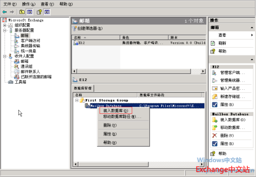 11、在完成数据库的还原后还需要将库据库装入,在Exchange管理控制台中展开“服务器配置” – “邮箱” ,在“数据库管理中”右键选择相应的数据库,然后选择“装入数据库”。