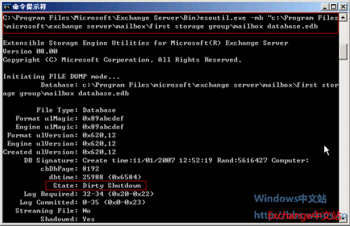 13、使用Eseutil工具来检查数据库的状态,发现为Dirty Shutdown状态。因此需要对数据库进行修复。Eseutil是一套可以对数据库进行碎片整理的工具,早在Exchange 5.5中就已经存在此套软件,请参考:Eseutil下载以及Eseutil使用说明。