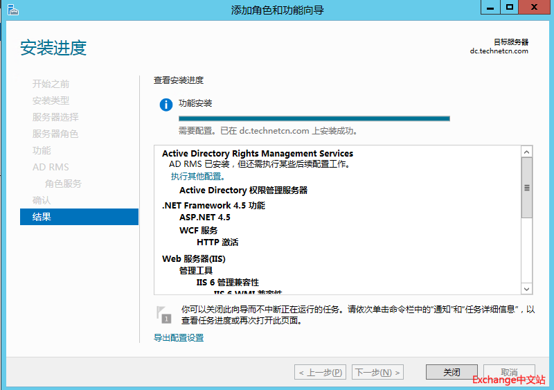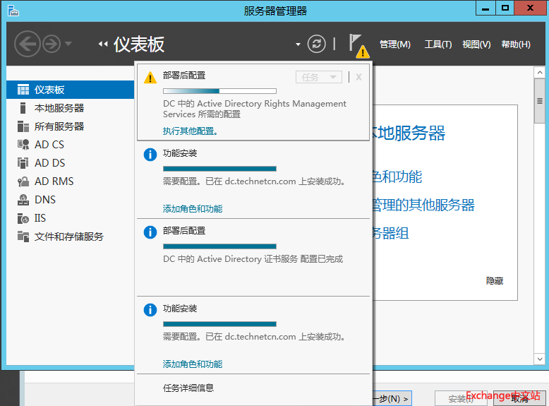 完成角色添加后,需要打开仪表板上方的旗帜来完成AD RMS的配置。如下图。