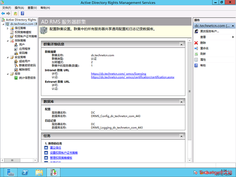 重新登陆后,打开AD RMS工具,就可看到如下的界面。