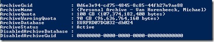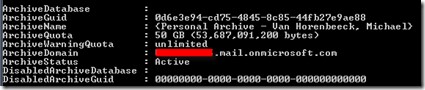 上图中可以看到该用户的归档已经成功建立(ArchiveStatus = Active)。但是我们似乎还少了一步验证。这是因为在组织内部无法获得在Office365端归档状态的信息。要获取这个信息,你需要建立一个到Exchange Online的powershell会话,然后通过Get-MailUser | fl *arch*命令做验证。