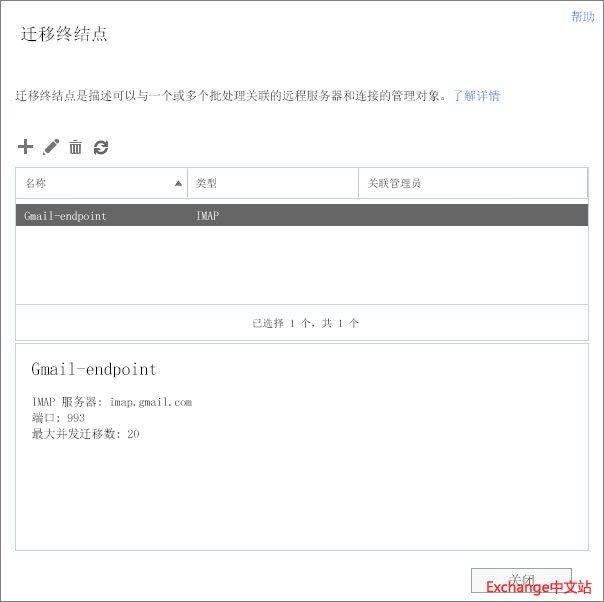 4、选择加号图标 (+) 创建新的迁移终结点。 5、在“选择迁移终结点类型”页上,选择“IMAP”。 6、将“IMAP 服务器”设置为“imap.gmail.com”,并保留相同的默认设置。