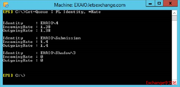 当你在Exchange 2013的管理命令行中输入Get-Queue命令时,你会看见队列有一个速率(Velocity)的属性(这个属性在队列查看器工具中没有):