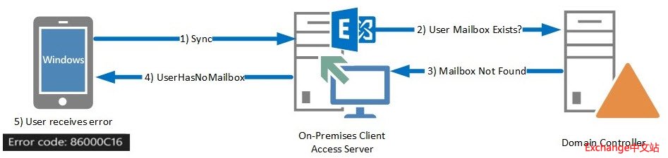 这个现象的根本在于邮箱迁移后,EAS设备依然尝试访问邮箱的原地址,也就是内部的Exchange服务器,而内部的CAS不会将请求转到云端。一旦在内部没有找到EAS用户的邮箱,CAS服务器就返还给客户错误代码了。简单的图示就是下面酱紫。