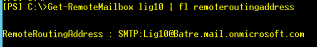 以下命令可以查看目标用户的RemoteRoutingAddress,注意SMTP后缀为Batre.mail.onmicrosoft.com