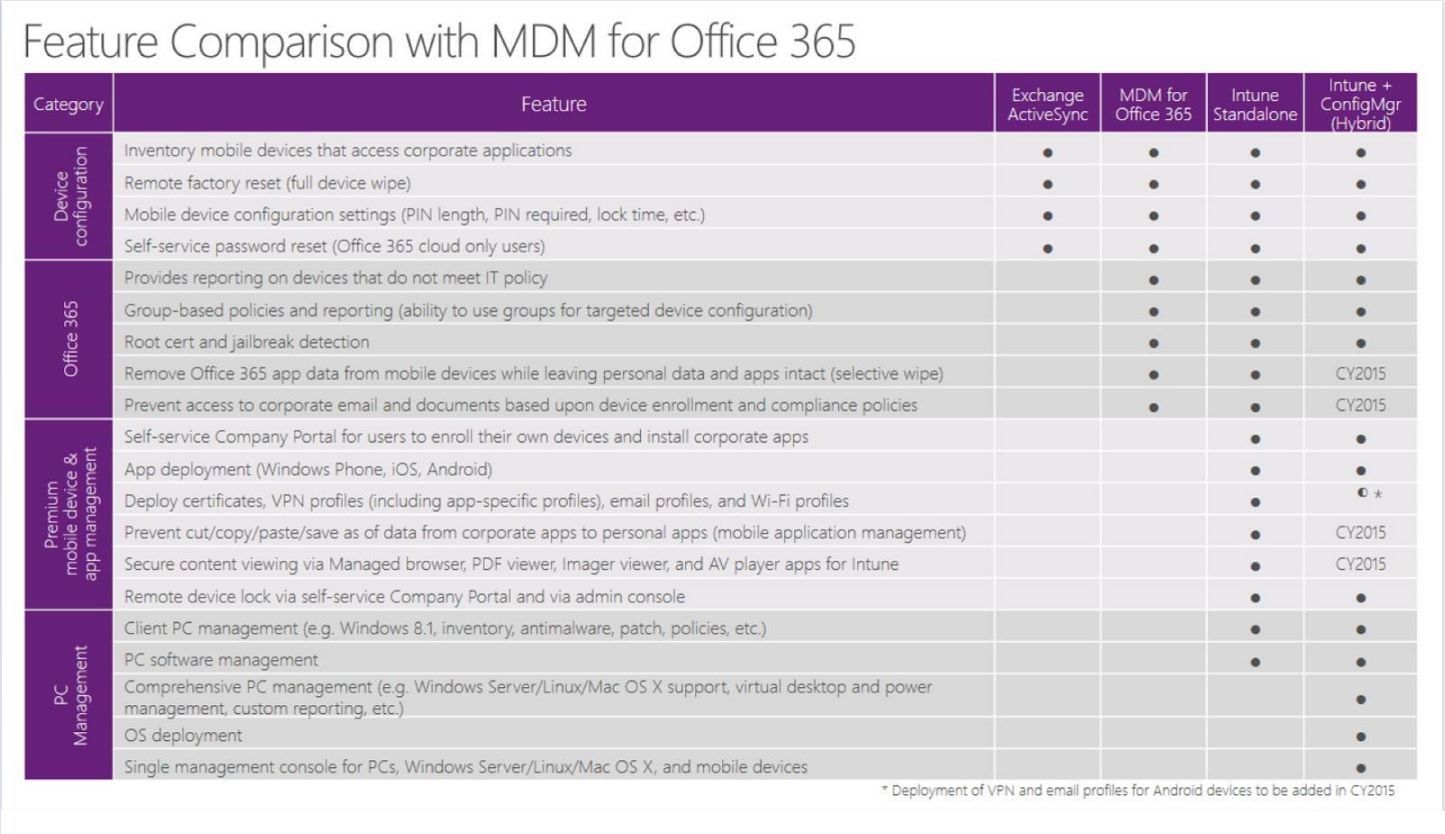 从上图几个管理接口的功能对比来看,ActiveSync,MDM for Office365,Intune Standalone以及Intune+ConfigMgr(Hybrid)之间还是有很大差别的。您可以根据实际需要选择对应的解决方案。