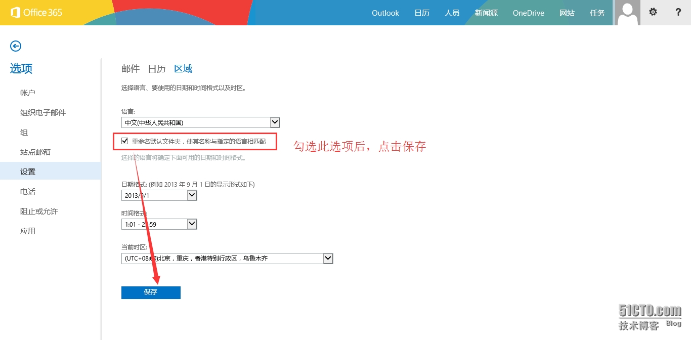 - 首次登陆OWA根据提示选择语言和时区,点击“保存”