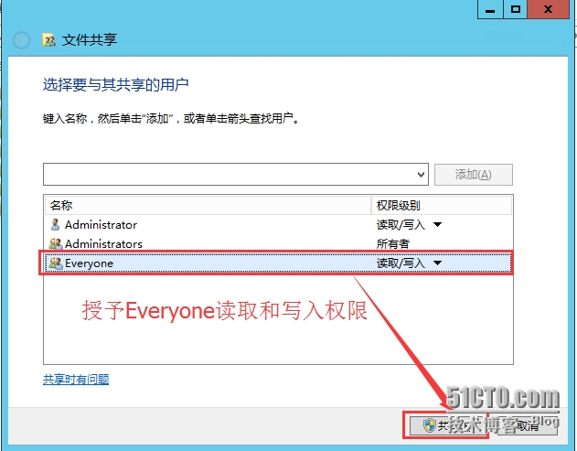 授权Everyone 读取和写入的权限,点击“共享”
