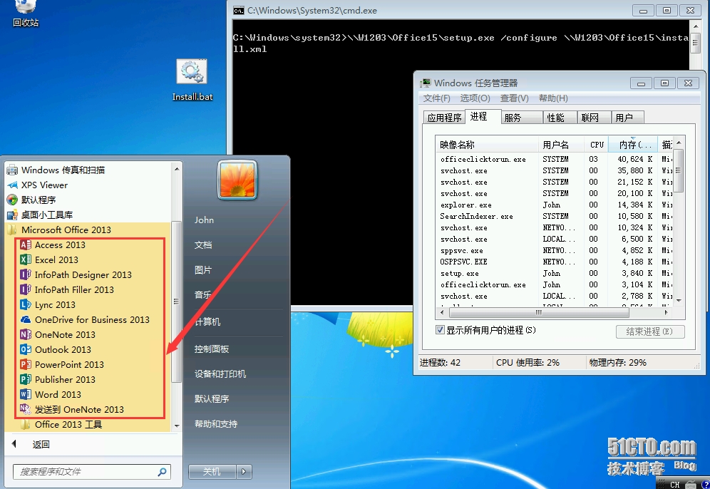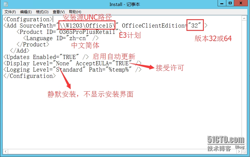 - 新建记事本并将命令\\W1203\Office15\setup.exe /configure \\W1203 \Office15\install.xml复制后,修改后缀为.bat, 以管理员身份运行Install.bat