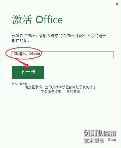 - 打开Office产品,(此处用Excel举例子)在弹出的激活向导中输入O365账号,“下一步”