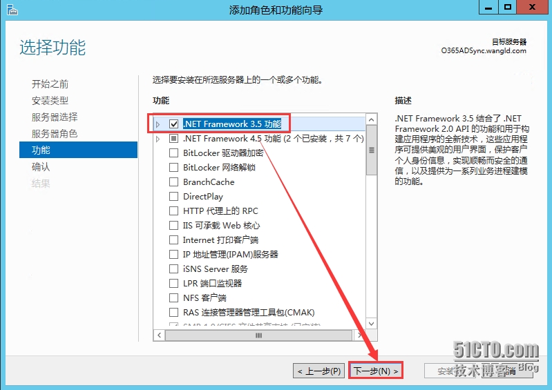 3.1 将活动目录服务器加入域后,通过服务器管理器安装Microsoft .NET Framework 3.5(Microsoft .NET Framework4.5在Windows Server 2012 R2默认已经安装好了)勾选“.NET Framework 3.5功能”,点击“下一步”