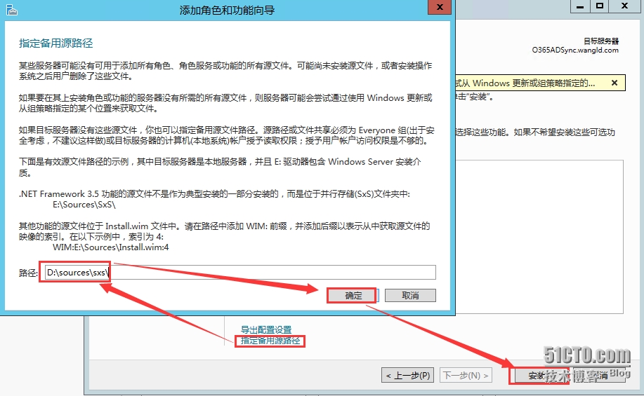 3.2 点击“指定备用源路径”指定系统所在路径(D:\sources\sxs\)点击“确定”—“安装”(在Windows Server2012 R2 安装.Net 3.5必须指定源光盘路径)