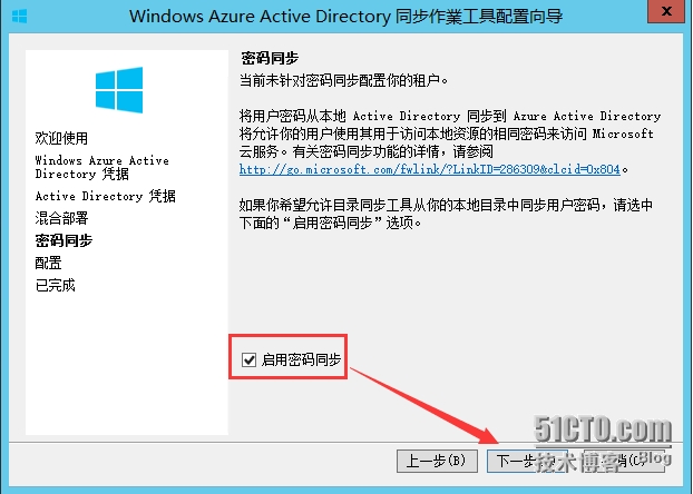 3.13 如需将本地AD用户密码同步至Azure AD,勾选“启用密码同步”,点击“下一步”