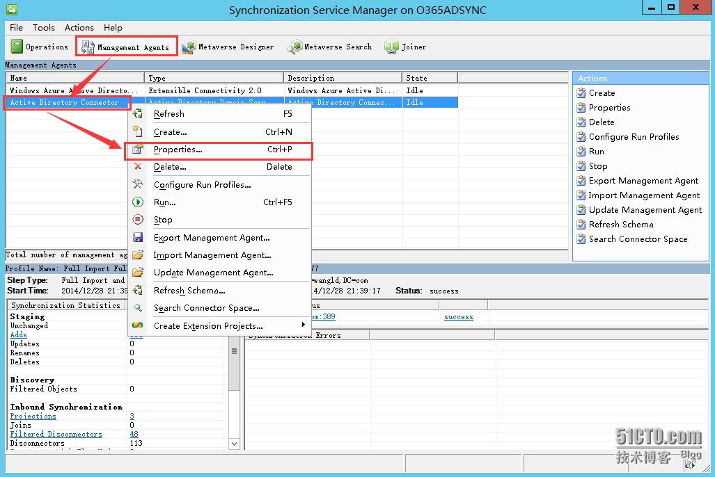 4.2 在目录同步计算机上打开miisclient, 默认路径在”C:\Program Files\Windows Azure Active DirectorySync\SYNCBUS\Synchronization Service\UIShell” 切换到“Management Agents”,右键“Active DirectoryConnector”选择“Properties”