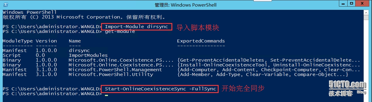4.7 以管理员身份运行WindowsPowerShell,运行命令“Import-Module dirsync”导入模块,接着运行命令“Start-OnlineCoexistenceSync-fullsync”重新完全同步;