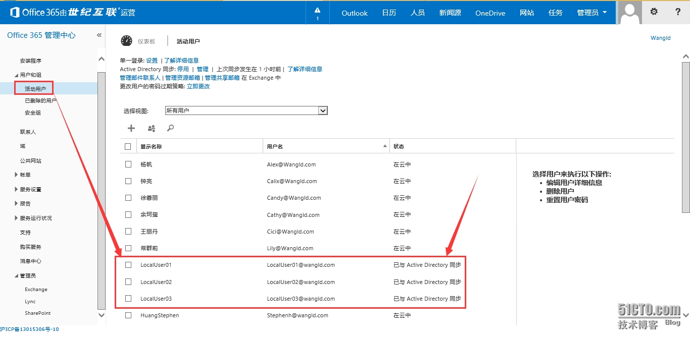5.1 登录O365管理中心,切换到“活动用户”,可看到已经成功从本地AD中同步了3个用户,且状态为“已与Active Directory同步”(如果同步了本地的安全组,可在“安全组”选项中看到)