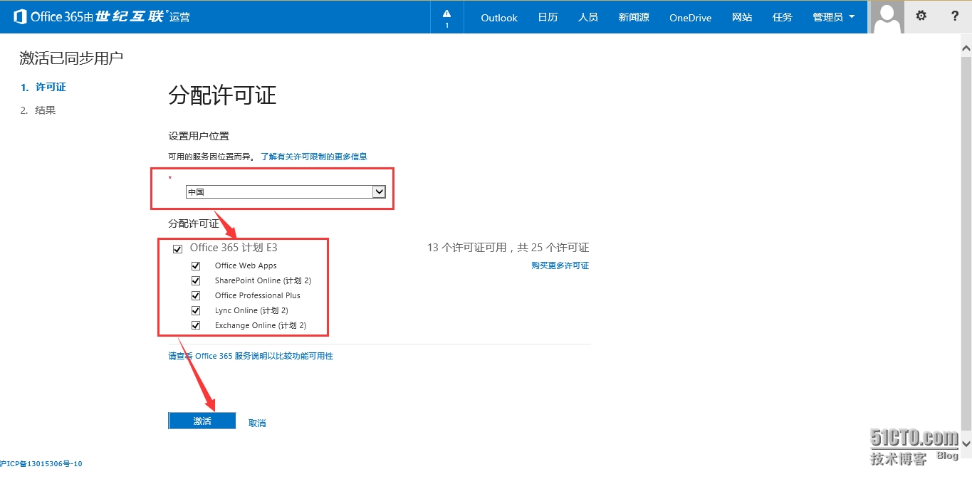 5.3 选择用户位置和分配许可证,点击”激活”